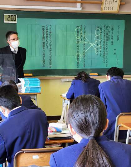 2年生「国語」の授業です。「ショートショート」を書く授業です。ショートショートといえば、星新一さんの作品を思い浮かべる人が多いことでしょう。不思議な話を短い文章で書き表します。最後の意外な結末は・・。