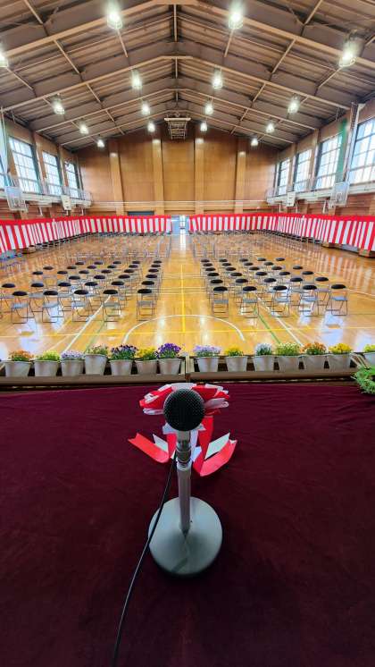 写真3 体育館 会場の準備も整いました。62名の新入生を迎え入れます。