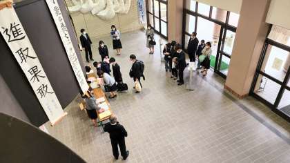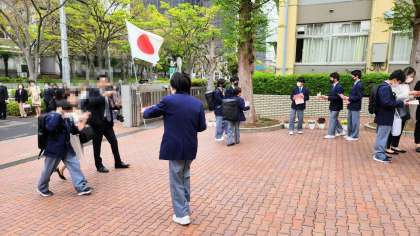 写真1 正門にて、2・3年生が大変よく新入生の案内を行ってくれました