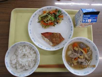 ご飯・魚のねぎ味噌焼き(あかうお)・シラスのさっぱり煮・豚汁・牛乳