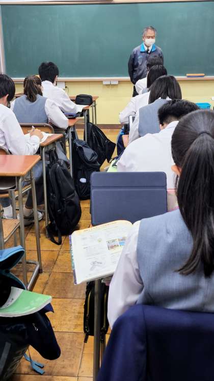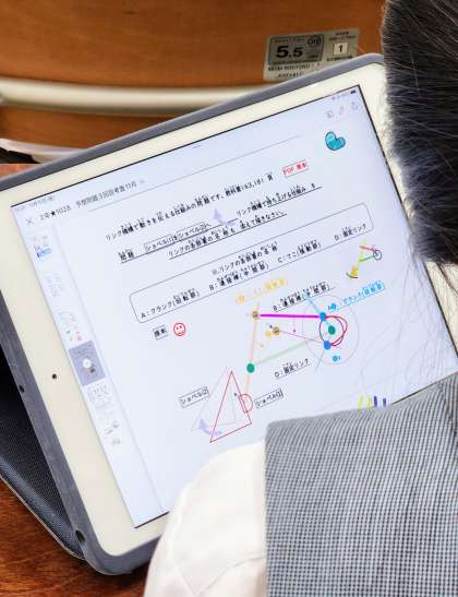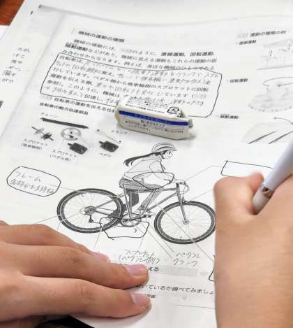 最も基本的な技術である「回転運動を伝える仕組」を学習しています。自転車の場合、人の足からの力を、どのようにして自転車の車輪の回転運動にしているか等を考えます。iPadタブレットも活用しながら考えます。