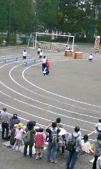 全学年による障害物競走です。ハードル、跳び箱平均台、網くぐり、麻袋のなかで両足とびの障害を懸命に駆け抜けています。