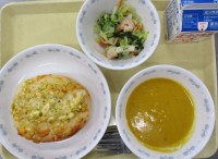 ジャンバラヤ ふわふわ豆腐スープ ヨーグルトあえ 牛乳