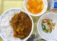 ごはん レバーかつ 小松菜とひじきのごまマヨ和え 里芋と野菜の味噌汁 みかん 牛...