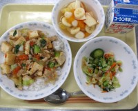 生揚げと野菜のあんかけ丼 野菜のかわりソースあえ 白玉ポンチ 牛乳