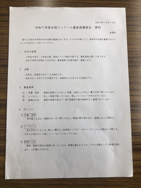 10月16日(木)の放課後に、けやき祭・合唱コンクールの審査員の打ち合わせが行われました。審査基準等の説明と審査の練習として過去の合唱映像から審査することを行いました。審査なので、公正に行って欲しいと...