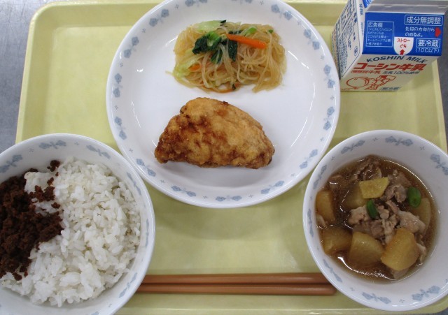 ごはん かつおでんぶ 赤魚の竜田揚げ 大根と豚肉のしょうが煮 春雨和え 牛乳
