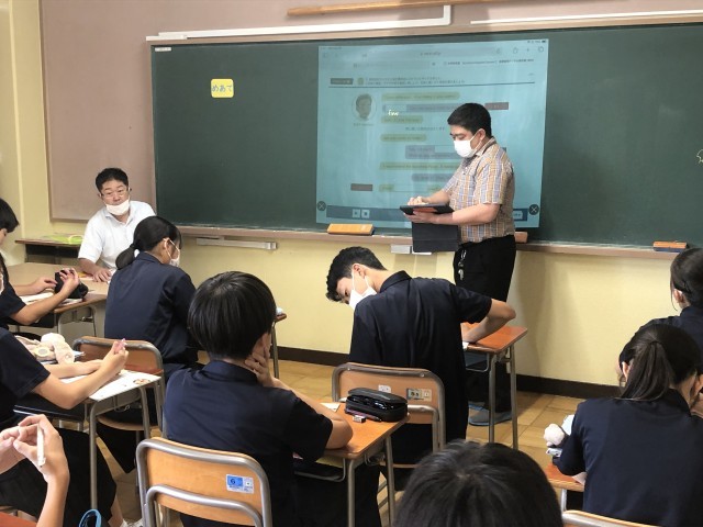授業の様子、今回は英語です。英語は2クラスを3展開(3人の先生)で授業を行う「少人数指導」を敷いています。この形態は数学も同様です。さらにALTが入るので、少人数で先生が2名という時があります。英語は...