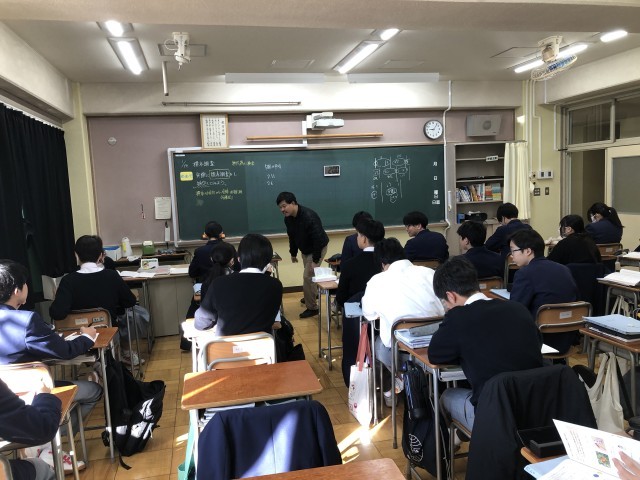 授業の様子、今回は英語です。英語は2クラスを3展開(3人の先生)で授業を行う「少人数指導」を敷いています。この形態は数学も同様です。さらにALTが入るので、少人数で先生が2名という時があります。英語は...
