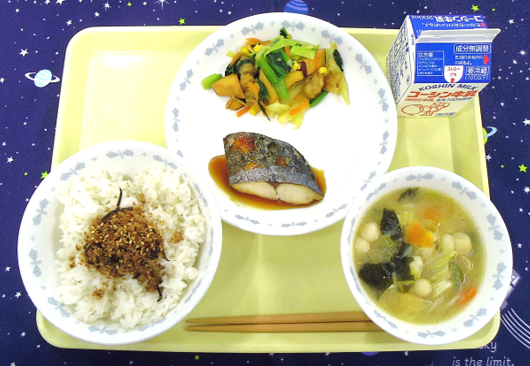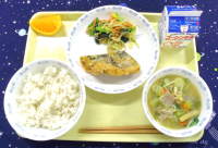 12日(木)・ご飯・ごま昆布ふりかけ・鰆の照り焼き・小松菜と揚げアサリのピリ辛和え・豆腐と麩のみそ汁・牛乳13日(金)・スパゲッティミートソース・じゃこ大根サラダ・ココアケーキ・牛乳
