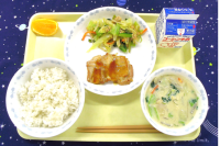 2月27日(金) 【リクエスト給食】・ご飯★鶏の照り焼き・もやしの一味醤油和え・呉汁・清美オレンジ・牛乳 2月最後のリクエスト給食は鶏の照り焼きです。リクエストをくれたクラスも多く、1-1、1-4、2...