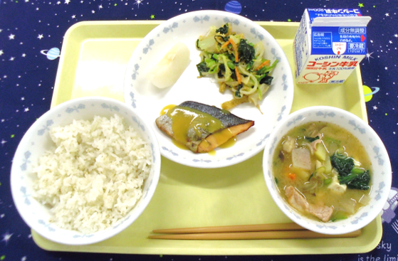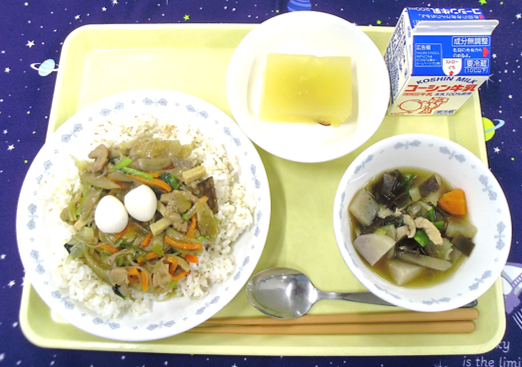 「ごぼとん丼」は地元のフルーツを餌に育った豚と地元産のごぼうを使った町おこしの為に作られたどんぶり料理です。本来は大きく切られた豚肉をどんぶりに盛り付けて醤油あんかけをかけるのですが、給食では豚肉とごぼうとその他の野菜を合わせて甘辛く煮込んだあんかけを上からかけました。