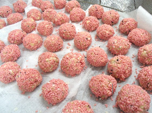 今回はモチ米蒸しの赤を野菜のビーツの汁で漬け込んだのですが、蒸す前まではきれいなピンク色で、これはきれいな仕上がりになると期待していたところ、蒸しあがったら色が馴染んでしまいきれいな発色とはいきませんでした。ですが、赤と白の違いはわかるのでとりあえずは一安心でした。