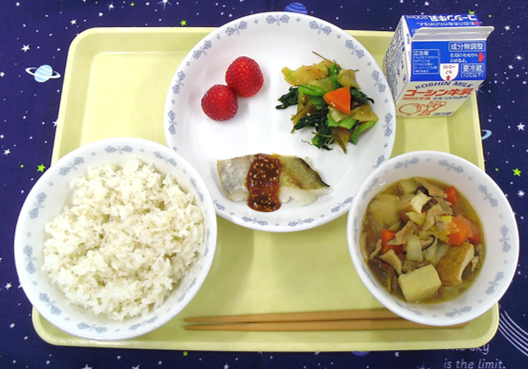 山形県では本来「ハタハタの田楽」がとても有名なのですが、ハタハタの不漁がつづき仕入れるのが難しいとのことで、山形では寒鱈も有名なので、鱈に田楽味噌をかけて提供しました。鱈にも注目してほしかったのですが、味噌が美味しかったようで、「ご飯にかけて食べたい。」「魚は苦手だけど味噌が美味しい。」という意見が生徒から出ていました。