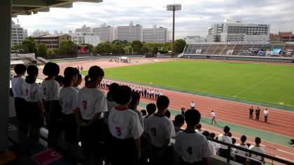 江戸川区陸上競技場において、「第68回江戸川区立中学校陸上競技大会」が開催されます。開会式も終わり、これから競技が始まります。選手全員が自己ベストを目指し、精一杯頑張って欲しいと思います。