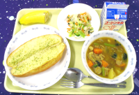 10日(水)・ガーリックトースト・豚肉のカレー煮・フレンチドレッシングサラダ・バ...