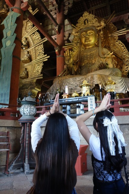 今日(きょう)から一泊(いっぱく)二日(ふつか)で、京都(きょうと)奈良(なら)へ修学旅行(しゅうがくりょこう)に向(む)かいました。奈良(なら)では東大寺(とうだいじ)の南大門(なんだいもん)にある金剛力士像(こんごうりきしぞう)を見上(みあ)げ、大仏殿(だいぶつでん)をじっくり見学(けんがく)しました。