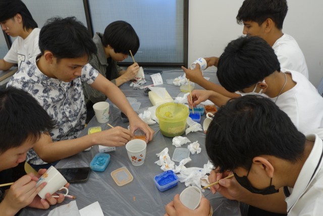 その後(ご)、京都(きょうと)で、数珠(じゅず)やコップに絵付(えつ)けをする体験学習(たいけんがくしゅう)をしました。