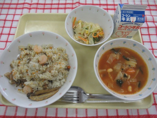 えびピラフ、わかさぎのカレー揚げ、チキンとコーンのサラダ、大豆と野菜のトマトスープ、牛乳