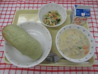 今日の汁物は山形県の芋煮です。里芋、こんにゃく、ねぎ、きのこ等を煮込んで食べます。牛肉を使ったしょうゆ味や豚肉を使ったみそ味があります。今日の給食では庄内地方のみそ味にしました。