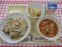 「けんちん汁」は、大根・にんじん・ごぼうなどの根菜とこんにゃく、豆腐などを入れたすまし汁です。今では家庭料理の一つになっていますが、神奈川県鎌倉市にある建長寺の精進料理が発祥という説があります。お寺の名前から「建長汁」と呼ばれていたのが、徐々になまって「けんちん汁」になったといわれています。精進料理なので、肉魚などは使わず、だし汁も昆布や干ししいたけでとるのが正式だそうですが、今日の給食のけんちん汁はかつお節を使ってだし汁をとり、鶏肉も入れて作りました。体が温まって寒い日にぴったりです。