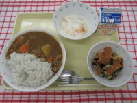 【今日の献立】・チキンカレーライス・パリパリ海藻サラダ・フルーツヨーグルト・牛乳