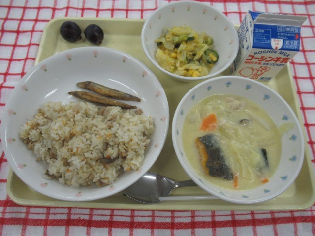 【今日の献立】・さつまいもごはん・鶏肉の香味焼き・小松菜とわかめのおひたし・月見...