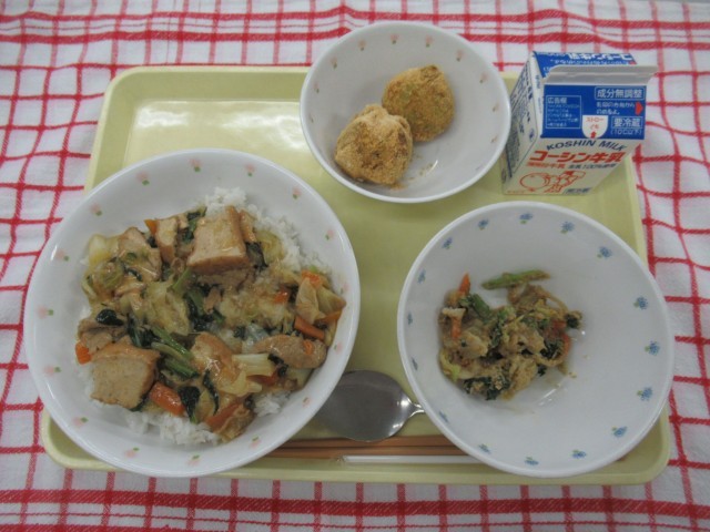 【今日の献立】  ※小松菜一斉給食・小松菜と生揚げのあんかけ丼・小松菜ともやしの...