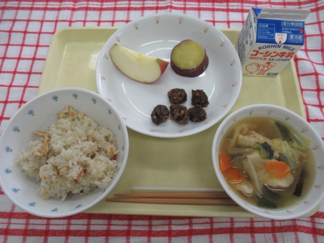 【今日の献立】・大根めし・くじらの唐揚げ・ふかし芋・すいとん・りんご・牛乳