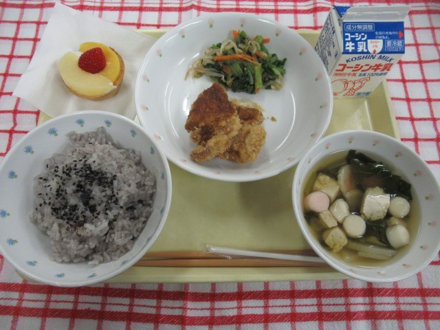 【今日の献立】 ※卒業祝い献立・お赤飯・ヒレカツ・なばなのおひたし・紅白はんぺん...