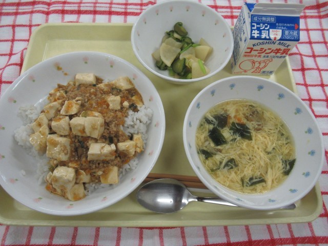 【今日の献立】麻婆丼、かぶときゅうりの中華和え、きのこと卵のスープ、牛乳