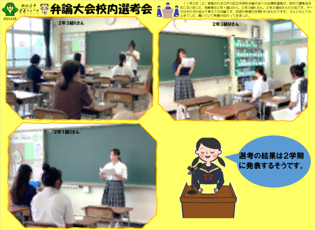 11月2日(土)に行われる【江戸川区立中学校弁論大会】に、本校の代表者1名を決める選考会がありました。立候補したのは2年生3名です。テーマは各自が考えての弁論となります。3名とも内容も表現も練習の成果を発揮していました。結果は2学期に発表されます。