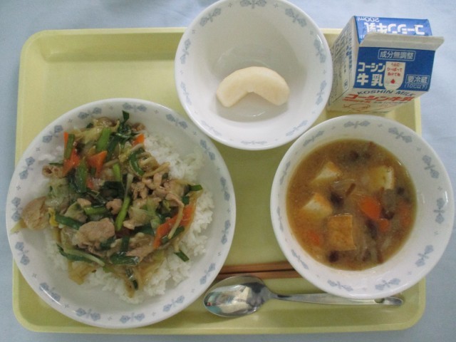 牛乳、豚肉と野菜のしょうが風味丼、なめこと根菜のみそ汁、梨