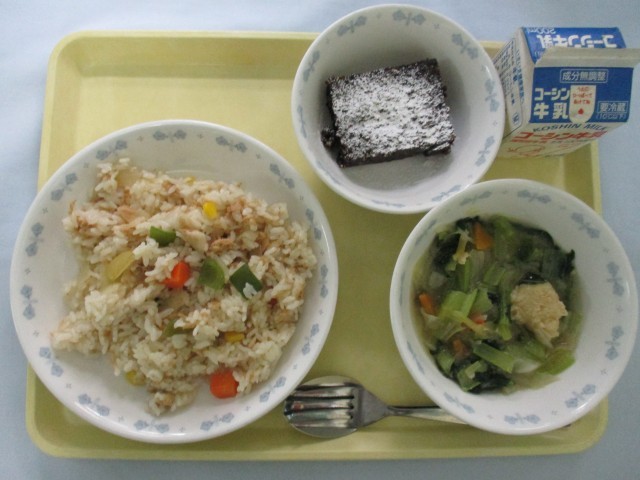 牛乳、ツナピラフ、肉団子とキャベツのスープ、ココアケーキ