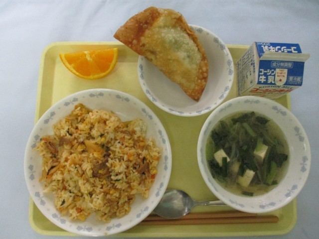 牛乳、キムチチャーハン、揚げぎょうざ、春雨のスープ、オレンジ