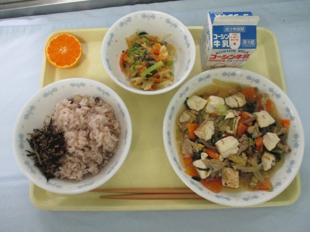 牛乳、雑穀ご飯、ひじきのふりかけ、肉豆腐、もみじおろし和え、みかん