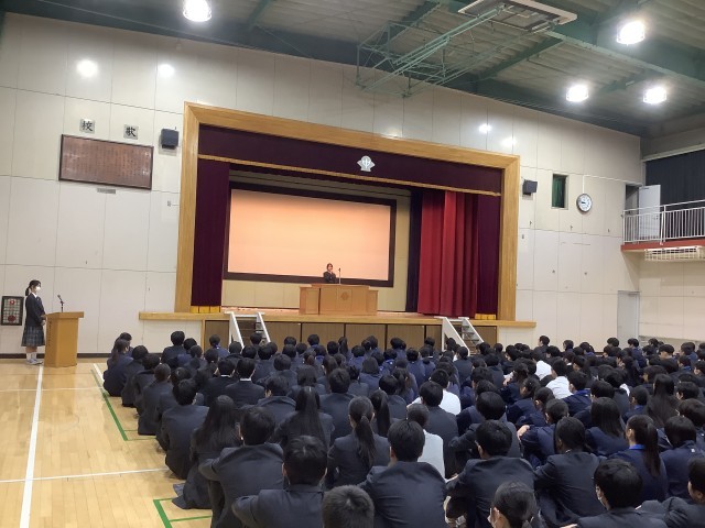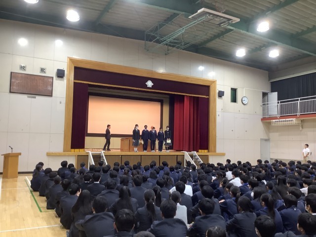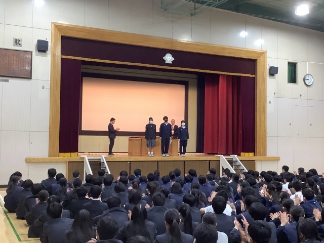 本日の朝礼では校長先生と生活指導主任の話の他に、教育実習生の紹介、表彰(よい歯のポスターコンクール・読書感想文)、生徒会の話がありました。
