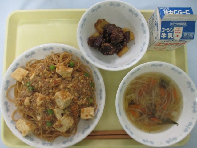 牛乳、マーボー焼きそば、レバーとポテトの中華揚げ、もやしスープ