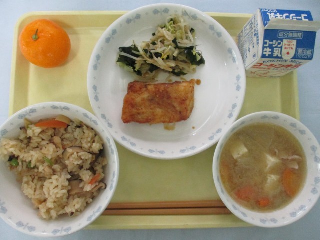 牛乳、かやくご飯、たらブロックの揚げ煮、もやしのごま浸し、豚汁、みかん