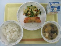 牛乳、コーンライス、レンズ豆のトマトシチュー、ローストチキン、2色ゼリー