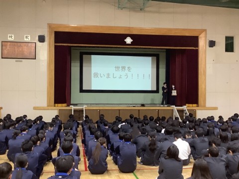 校長先生のお話、表彰(ソフトテニス部、バレーボール部)、生活指導主任の話、の順に進んで、最後に生徒会から「ユニセフ募金」のお知らせがありました。