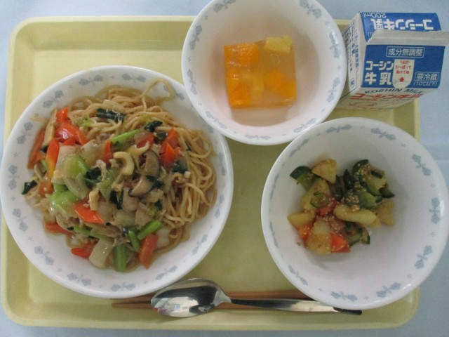 牛乳、八宝めん、じゃがいもの中華風ごま和え、フルーツミックスゼリー