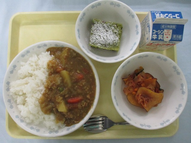 牛乳、カレーライス、やさいチップス、抹茶ケーキ