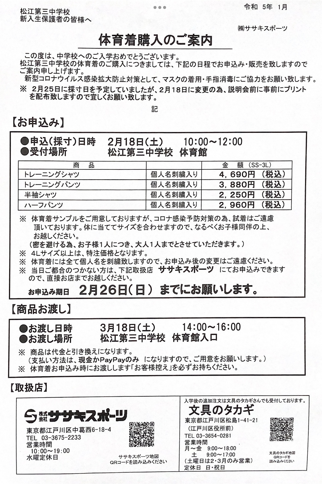 →●体育着採寸・購入について