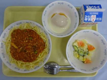 牛乳 スパゲッティミートソース ポテトサラダ 桃のミルクソースがけ