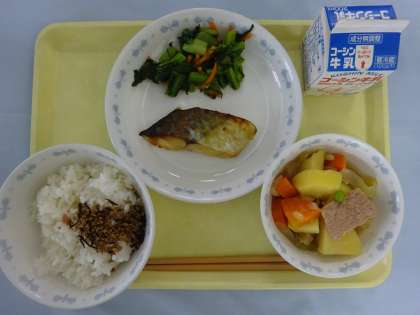 牛乳 ご飯 鮭とひじきのふりかけ 魚の西京焼き 菜の花のからし和え 肉じゃが