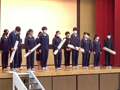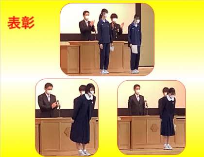 今回は最後の朝礼です。前半に各部活動(バレーボール部、美術部、吹奏楽部)の表彰が行われました。最後に生徒会(1・2年在校生)から3学年へのサプライズがあり、お礼のメッセージが贈呈されました。先輩たちへの感謝の気持ちがしっかりと伝わったのではないでしょうか。