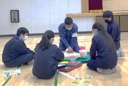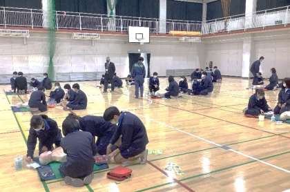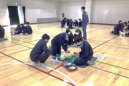 体育館で「救命救急講習会」を行いました。ダミーの人形を使って119番通報依頼、AEDを使って電気ショックの仕方、心肺蘇生の方法などを学習しました。保健の授業でも学習はしましたが、実際に体験して体で覚えられて良かったと思います。みんな集中して真剣に行っていました。