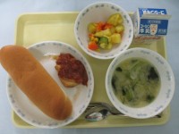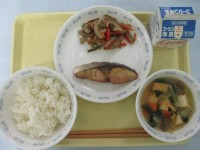牛乳、ご飯、ますの照り焼き、五目豆、鋳物汁