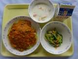 スパゲッティ ミートソース 小松菜サラダ フルーツヨーグルト 牛乳 給食のミー...